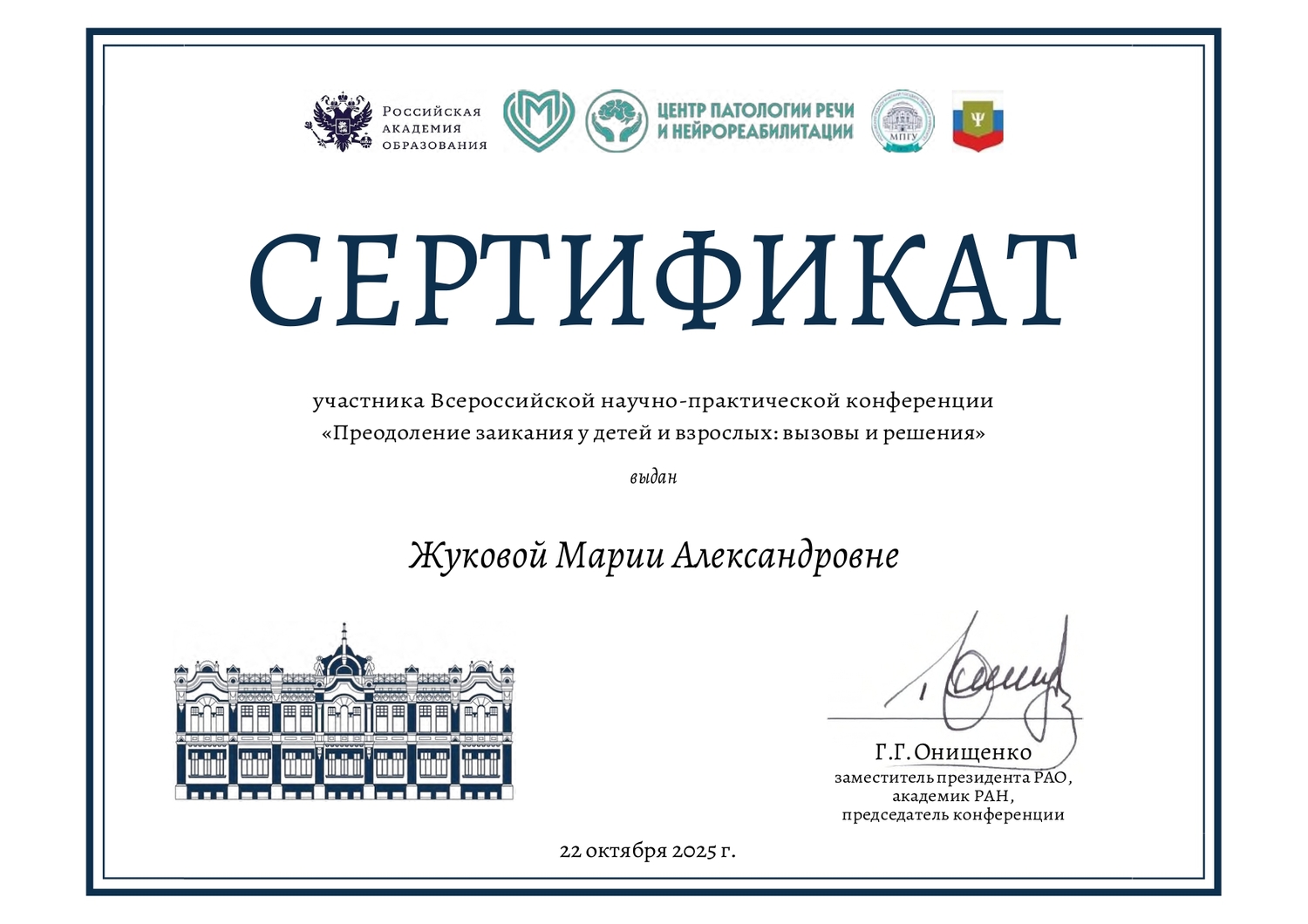 Приняла участие во Всероссийской научно-практической конференции «Преодоление заикания у детей и взрослых: вызовы и решения», состоявшейся 22 октября 2025 г в Центре патологии речи и нейрореаилитации.